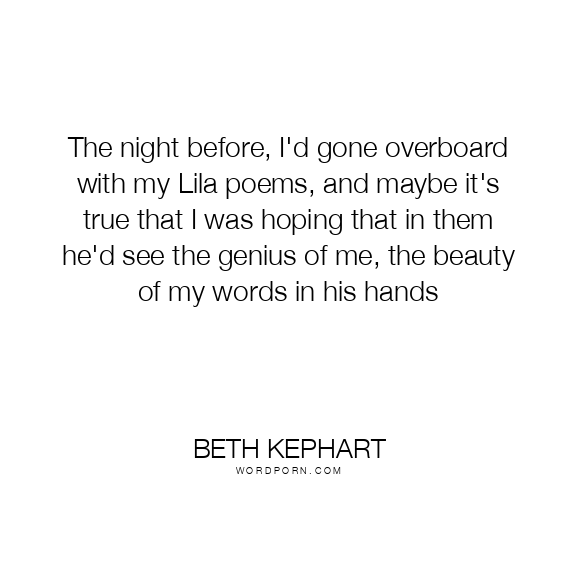 The night before, I'd gone overboard with my Lila poems, and maybe it's true that I was hoping that in them he'd see the genius of me, the beauty of my words in his hands