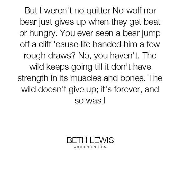 But I weren't no quitter No wolf nor bear just gives up when they get beat or hungry. You ever seen a bear jump off a cliff 'cause life handed him a few rough draws? No, you haven't. The wild keeps going till it don't have strength in its muscles and bones. The wild doesn't give up; it's forever, and so was I