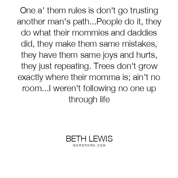 One a' them rules is don't go trusting another man's path...People do it, they do what their mommies and daddies did, they make them same mistakes, they have them same joys and hurts, they just repeating. Trees don't grow exactly where their momma is; ain't no room...I weren't following no one up through life