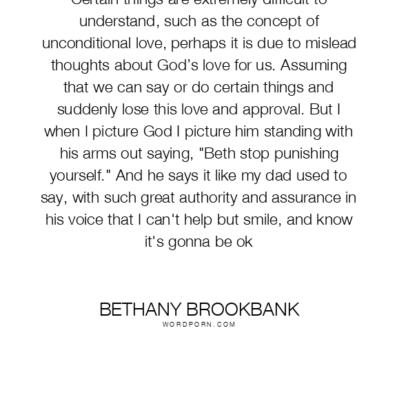 Certain things are extremely difficult to understand, such as the concept of unconditional love, perhaps it is due to mislead thoughts about God’s love for us. Assuming that we can say or do certain things and suddenly lose this love and approval. But I when I picture God I picture him standing with his arms out saying, "Beth stop punishing yourself." And he says it like my dad used to say, with such great authority and assurance in his voice that I can't help but smile, and know it's gonna be ok