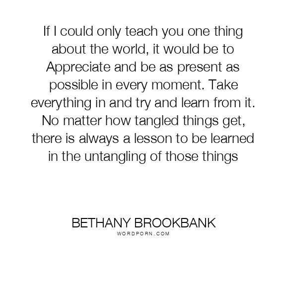 If I could only teach you one thing about the world, it would be to Appreciate and be as present as possible in every moment. Take everything in and try and learn from it. No matter how tangled things get, there is always a lesson to be learned in the untangling of those things
