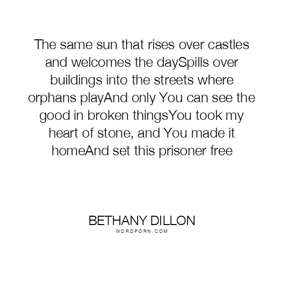 The same sun that rises over castles and welcomes the daySpills over buildings into the streets where orphans playAnd only You can see the good in broken thingsYou took my heart of stone, and You made it homeAnd set this prisoner free