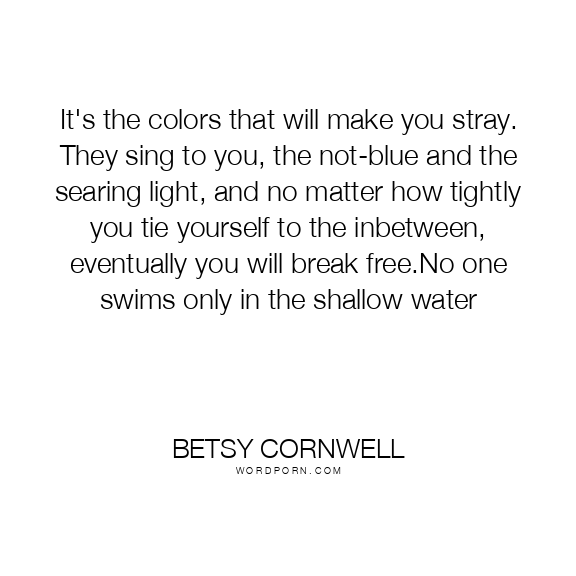 It's the colors that will make you stray. They sing to you, the not-blue and the searing light, and no matter how tightly you tie yourself to the inbetween, eventually you will break free.No one swims only in the shallow water