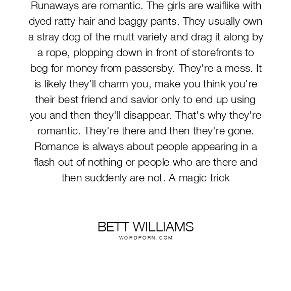 Runaways are romantic. The girls are waiflike with dyed ratty hair and baggy pants. They usually own a stray dog of the mutt variety and drag it along by a rope, plopping down in front of storefronts to beg for money from passersby. They're a mess. It is likely they'll charm you, make you think you're their best friend and savior only to end up using you and then they'll disappear. That's why they're romantic. They're there and then they're gone. Romance is always about people appearing in a flash out of nothing or people who are there and then suddenly are not. A magic trick