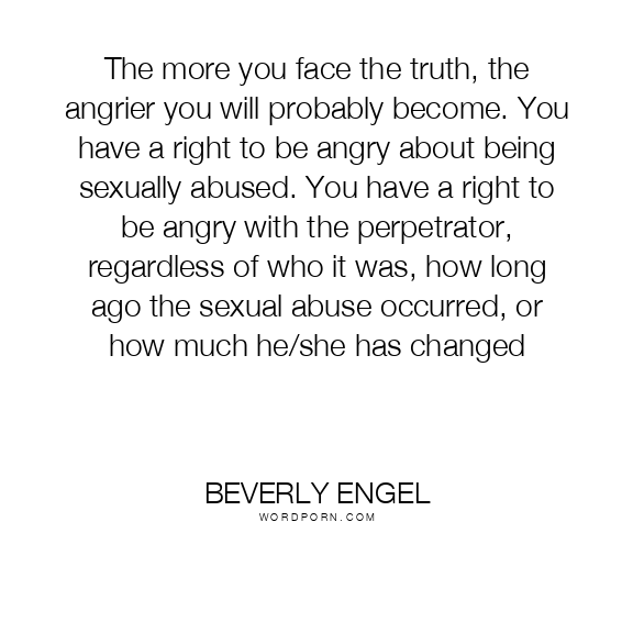 The more you face the truth, the angrier you will probably become. You have a right to be angry about being sexually abused. You have a right to be angry with the perpetrator, regardless of who it was, how long ago the sexual abuse occurred, or how much he/she has changed