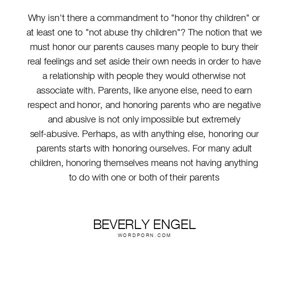 Why isn't there a commandment to "honor thy children" or at least one to "not abuse thy children"? The notion that we must honor our parents causes many people to bury their real feelings and set aside their own needs in order to have a relationship with people they would otherwise not associate with. Parents, like anyone else, need to earn respect and honor, and honoring parents who are negative and abusive is not only impossible but extremely self-abusive. Perhaps, as with anything else, honoring our parents starts with honoring ourselves. For many adult children, honoring themselves means not having anything to do with one or both of their parents