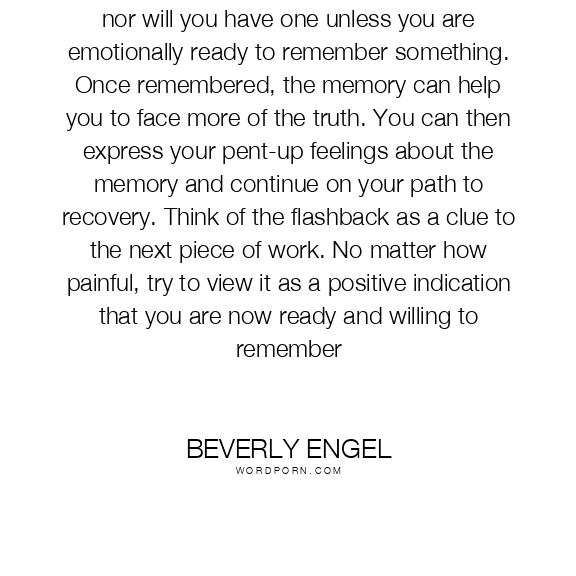 You cannot make yourself have a flashback, nor will you have one unless you are emotionally ready to remember something. Once remembered, the memory can help you to face more of the truth. You can then express your pent-up feelings about the memory and continue on your path to recovery. Think of the flashback as a clue to the next piece of work. No matter how painful, try to view it as a positive indication that you are now ready and willing to remember
