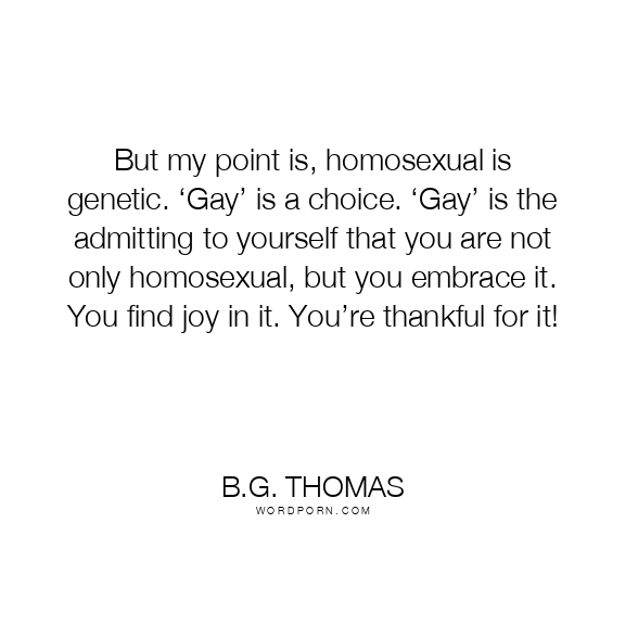 But my point is, homosexual is genetic. ‘Gay’ is a choice. ‘Gay’ is the admitting to yourself that you are not only homosexual, but you embrace it. You find joy in it. You’re thankful for it!