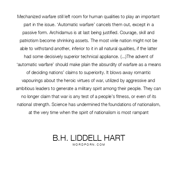 Mechanized warfare still left room for human qualities to play an important part in the issue. ‘Automatic warfare’ cancels them out, except in a passive form. Archidamus is at last being justified. Courage, skill and patriotism become shrinking assets. The most virile nation might not be able to withstand another, inferior to it in all natural qualities, if the latter had some decisively superior technical appliance. (...)The advent of ‘automatic warfare’ should make plain the absurdity of warfare as a means of deciding nations’ claims to superiority. It blows away romantic vapourings about the heroic virtues of war, utilized by aggressive and ambitious leaders to generate a military spirit among their people. They can no longer claim that war is any test of a people’s fitness, or even of its national strength. Science has undermined the foundations of nationalism, at the very time when the spirit of nationalism is most rampant