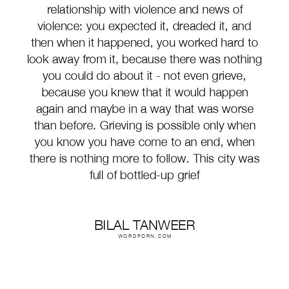 Living in this city, you developed a certain relationship with violence and news of violence: you expected it, dreaded it, and then when it happened, you worked hard to look away from it, because there was nothing you could do about it - not even grieve, because you knew that it would happen again and maybe in a way that was worse than before. Grieving is possible only when you know you have come to an end, when there is nothing more to follow. This city was full of bottled-up grief