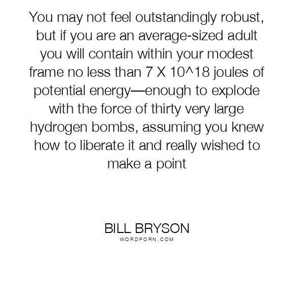 You may not feel outstandingly robust, but if you are an average-sized adult you will contain within your modest frame no less than 7 X 10^18 joules of potential energy—enough to explode with the force of thirty very large hydrogen bombs, assuming you knew how to liberate it and really wished to make a point