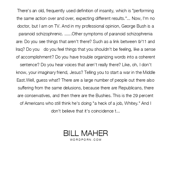 There's an old, frequently-used definition of insanity, which is "performing the same action over and over, expecting different results."... Now, I'm no doctor, but I am on TV. And in my professional opinion, George Bush is a paranoid schizophrenic. ......Other symptoms of paranoid schizophrenia are: Do you see things that aren't there? Such as a link between 9/11 and Iraq? Do you - do you feel things that you shouldn't be feeling, like a sense of accomplishment? Do you have trouble organizing words into a coherent sentence? Do you hear voices that aren't really there? Like, oh, I don't know, your imaginary friend, Jesus? Telling you to start a war in the Middle East.Well, guess what? There are a large number of people out there also suffering from the same delusions, because there are Republicans, there are conservatives, and then there are the Bushies. This is the 29 percent of Americans who still think he's doing "a heck of a job, Whitey." And I don't believe that it's coincidence that almost the same number of Americans - 25 percent - told a recent pollster that they believe that this year - this year, 2007 - would bring the Second Coming of Christ!I have a hunch these are the same people. Because, if you think that you're going to meet Jesus before they cancel "Ugly Betty," then you're used to doing things by faith. And if you have so much blind faith that you think this war is winnable, you're nuts and you shouldn't be allowed near a voting booth