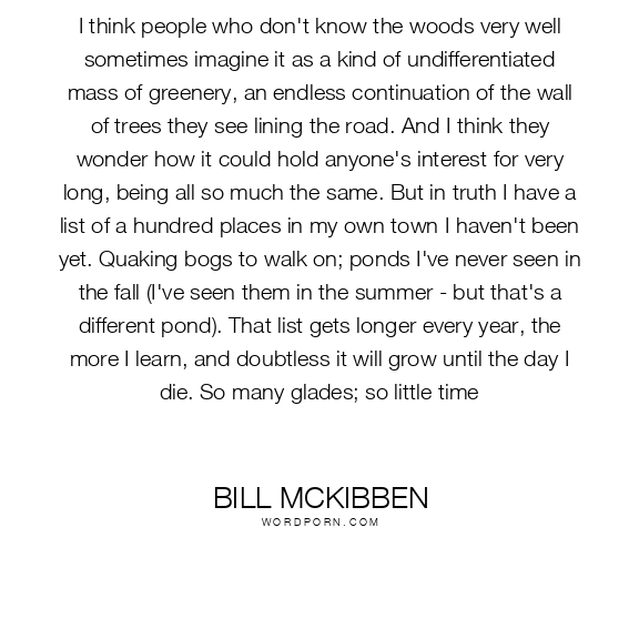 I think people who don't know the woods very well sometimes imagine it as a kind of undifferentiated mass of greenery, an endless continuation of the wall of trees they see lining the road. And I think they wonder how it could hold anyone's interest for very long, being all so much the same. But in truth I have a list of a hundred places in my own town I haven't been yet. Quaking bogs to walk on; ponds I've never seen in the fall (I've seen them in the summer - but that's a different pond). That list gets longer every year, the more I learn, and doubtless it will grow until the day I die. So many glades; so little time