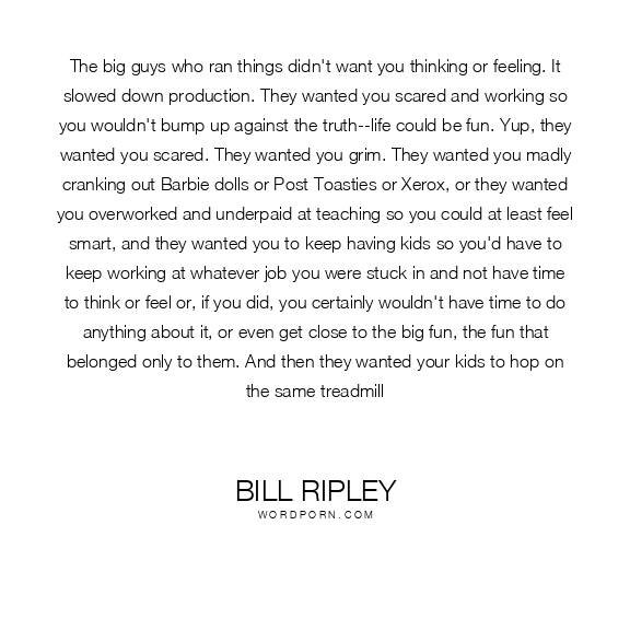 The big guys who ran things didn't want you thinking or feeling. It slowed down production. They wanted you scared and working so you wouldn't bump up against the truth--life could be fun. Yup, they wanted you scared. They wanted you grim. They wanted you madly cranking out Barbie dolls or Post Toasties or Xerox, or they wanted you overworked and underpaid at teaching so you could at least feel smart, and they wanted you to keep having kids so you'd have to keep working at whatever job you were stuck in and not have time to think or feel or, if you did, you certainly wouldn't have time to do anything about it, or even get close to the big fun, the fun that belonged only to them. And then they wanted your kids to hop on the same treadmill