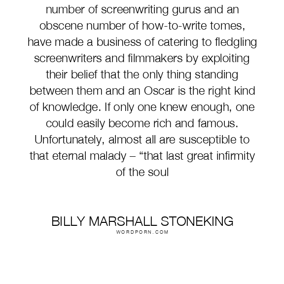 Too many film schools, as well as any number of screenwriting gurus and an obscene number of how-to-write tomes, have made a business of catering to fledgling screenwriters and filmmakers by exploiting their belief that the only thing standing between them and an Oscar is the right kind of knowledge. If only one knew enough, one could easily become rich and famous. Unfortunately, almost all are susceptible to that eternal malady – “that last great infirmity of the soul