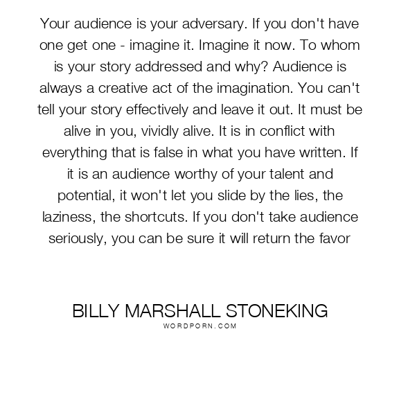Your audience is your adversary. If you don't have one get one - imagine it. Imagine it now. To whom is your story addressed and why? Audience is always a creative act of the imagination. You can't tell your story effectively and leave it out. It must be alive in you, vividly alive. It is in conflict with everything that is false in what you have written. If it is an audience worthy of your talent and potential, it won't let you slide by the lies, the laziness, the shortcuts. If you don't take audience seriously, you can be sure it will return the favor