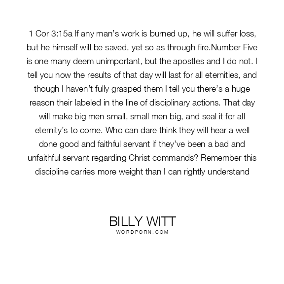 1 Cor 3:15a If any man’s work is burned up, he will suffer loss, but he himself will be saved, yet so as through fire.Number Five is one many deem unimportant, but the apostles and I do not. I tell you now the results of that day will last for all eternities, and though I haven’t fully grasped them I tell you there’s a huge reason their labeled in the line of disciplinary actions. That day will make big men small, small men big, and seal it for all eternity’s to come. Who can dare think they will hear a well done good and faithful servant if they’ve been a bad and unfaithful servant regarding Christ commands? Remember this discipline carries more weight than I can rightly understand