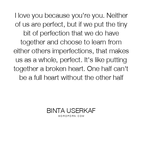 I love you because you're you. Neither of us are perfect, but if we put the tiny bit of perfection that we do have together and choose to learn from either others imperfections, that makes us as a whole, perfect. It's like putting together a broken heart. One half can't be a full heart without the other half