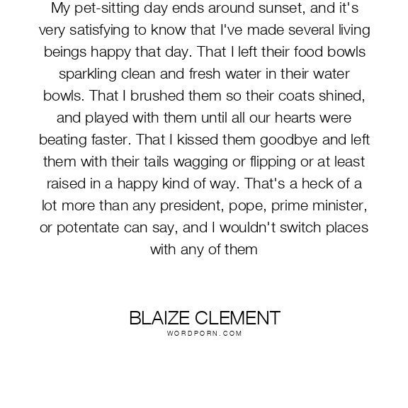 My pet-sitting day ends around sunset, and it's very satisfying to know that I've made several living beings happy that day. That I left their food bowls sparkling clean and fresh water in their water bowls. That I brushed them so their coats shined, and played with them until all our hearts were beating faster. That I kissed them goodbye and left them with their tails wagging or flipping or at least raised in a happy kind of way. That's a heck of a lot more than any president, pope, prime minister, or potentate can say, and I wouldn't switch places with any of them