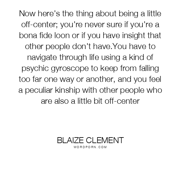 Now here's the thing about being a little off-center; you're never sure if you're a bona fide loon or if you have insight that other people don't have.You have to navigate through life using a kind of psychic gyroscope to keep from falling too far one way or another, and you feel a peculiar kinship with other people who are also a little bit off-center