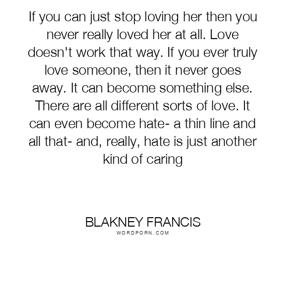 If you can just stop loving her then you never really loved her at all. Love doesn't work that way. If you ever truly love someone, then it never goes away. It can become something else. There are all different sorts of love. It can even become hate- a thin line and all that- and, really, hate is just another kind of caring
