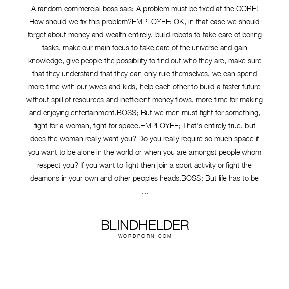 A random commercial boss sais; A problem must be fixed at the CORE! How should we fix this problem?EMPLOYEE; OK, in that case we should forget about money and wealth entirely, build robots to take care of boring tasks, make our main focus to take care of the universe and gain knowledge, give people the possibility to find out who they are, make sure that they understand that they can only rule themselves, we can spend more time with our wives and kids, help each other to build a faster future without spill of resources and inefficient money flows, more time for making and enjoying entertainment.BOSS; But we men must fight for something, fight for a woman, fight for space.EMPLOYEE; That's entirely true, but does the woman really want you? Do you really require so much space if you want to be alone in the world or when you are amongst people whom respect you? If you want to fight then join a sport activity or fight the deamons in your own and other peoples heads.BOSS; But life has to be agony as well!EMPLOYEE; We will have more things and people we care about to lose.BOSS; This all seems very easy.EMPLOYEE; I believe that people will take healthy responsibility when it's easy, accessible and because they want to.BOSS; I guess that the world can work as one tribe. We would be able to live on other planets within a year!