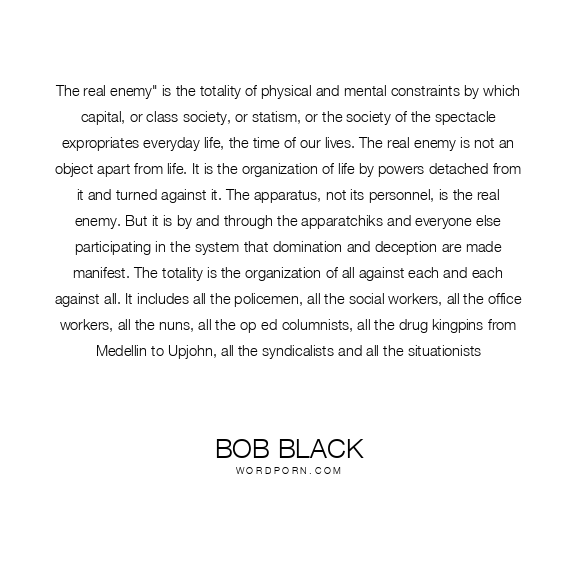 The real enemy" is the totality of physical and mental constraints by which capital, or class society, or statism, or the society of the spectacle expropriates everyday life, the time of our lives. The real enemy is not an object apart from life. It is the organization of life by powers detached from it and turned against it. The apparatus, not its personnel, is the real enemy. But it is by and through the apparatchiks and everyone else participating in the system that domination and deception are made manifest. The totality is the organization of all against each and each against all. It includes all the policemen, all the social workers, all the office workers, all the nuns, all the op-ed columnists, all the drug kingpins from Medellin to Upjohn, all the syndicalists and all the situationists