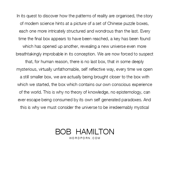 In its quest to discover how the patterns of reality are organised, the story of modern science hints at a picture of a set of Chinese puzzle boxes, each one more intricately structured and wondrous than the last. Every time the final box appears to have been reached, a key has been found which has opened up another, revealing a new universe even more breathtakingly improbable in its conception. We are now forced to suspect that, for human reason, there is no last box, that in some deeply mysterious, virtually unfathomable, self-reflective way, every time we open a still smaller box, we are actually being brought closer to the box with which we started, the box which contains our own conscious experience of the world. This is why no theory of knowledge, no epistemology, can ever escape being consumed by its own self-generated paradoxes. And this is why we must consider the universe to be irredeemably mystical