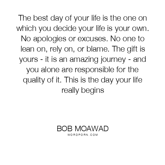 The best day of your life is the one on which you decide your life is your own. No apologies or excuses. No one to lean on, rely on, or blame. The gift is yours - it is an amazing journey - and you alone are responsible for the quality of it. This is the day your life really begins