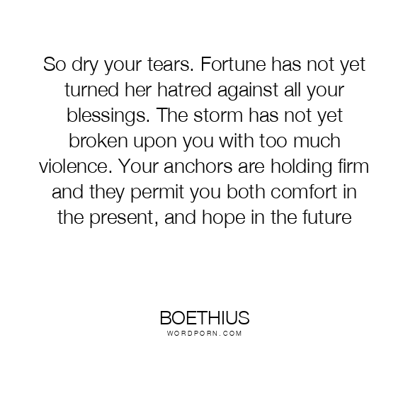 So dry your tears. Fortune has not yet turned her hatred against all your blessings. The storm has not yet broken upon you with too much violence. Your anchors are holding firm and they permit you both comfort in the present, and hope in the future
