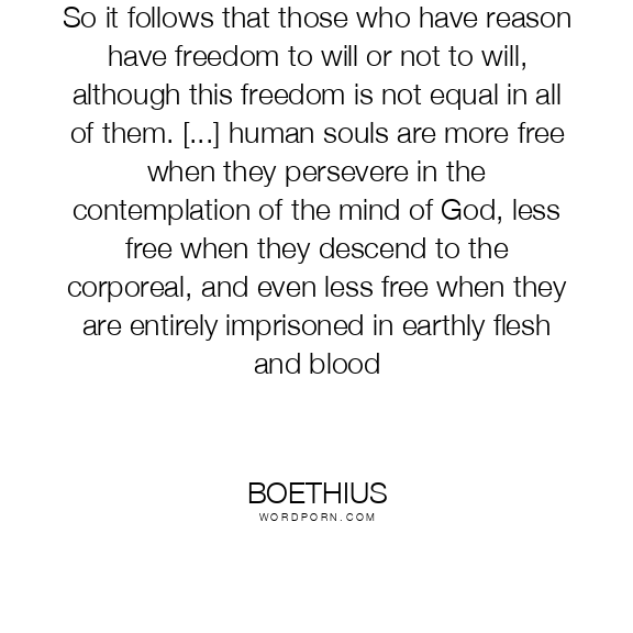 So it follows that those who have reason have freedom to will or not to will, although this freedom is not equal in all of them. [...] human souls are more free when they persevere in the contemplation of the mind of God, less free when they descend to the corporeal, and even less free when they are entirely imprisoned in earthly flesh and blood
