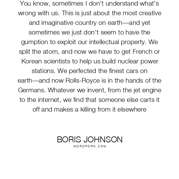 You know, sometimes I don't understand what's wrong with us. This is just about the most creative and imaginative country on earth—and yet sometimes we just don't seem to have the gumption to exploit our intellectual property. We split the atom, and now we have to get French or Korean scientists to help us build nuclear power stations. We perfected the finest cars on earth—and now Rolls-Royce is in the hands of the Germans. Whatever we invent, from the jet engine to the internet, we find that someone else carts it off and makes a killing from it elsewhere