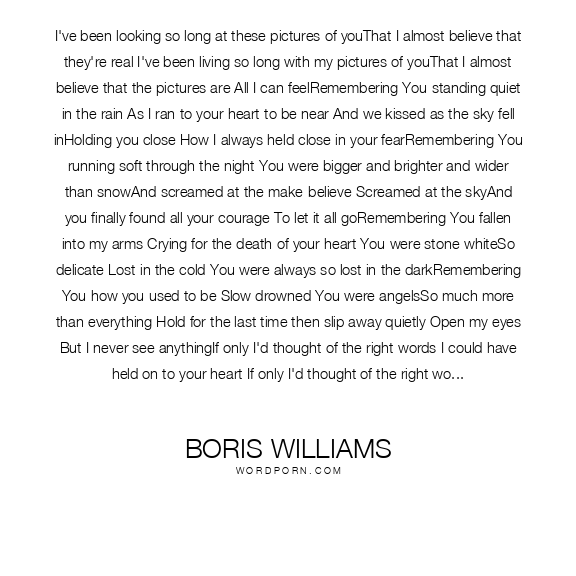 I've been looking so long at these pictures of youThat I almost believe that they're real I've been living so long with my pictures of youThat I almost believe that the pictures are All I can feelRemembering You standing quiet in the rain As I ran to your heart to be near And we kissed as the sky fell inHolding you close How I always held close in your fearRemembering You running soft through the night You were bigger and brighter and wider than snowAnd screamed at the make-believe Screamed at the skyAnd you finally found all your courage To let it all goRemembering You fallen into my arms Crying for the death of your heart You were stone whiteSo delicate Lost in the cold You were always so lost in the darkRemembering You how you used to be Slow drowned You were angelsSo much more than everything Hold for the last time then slip away quietly Open my eyes But I never see anythingIf only I'd thought of the right words I could have held on to your heart If only I'd thought of the right wordsI wouldn't be breaking apart All my pictures of youLooking so long at these pictures of you But I never hold on to your heart Looking so long for the words to be trueBut always just breaking apartMy pictures of youThere was nothing in the worldThat I ever wanted more Than to feel you deep in my heartThere was nothing in the world That I ever wanted moreThan to never feel the breaking apartAll my pictures of you