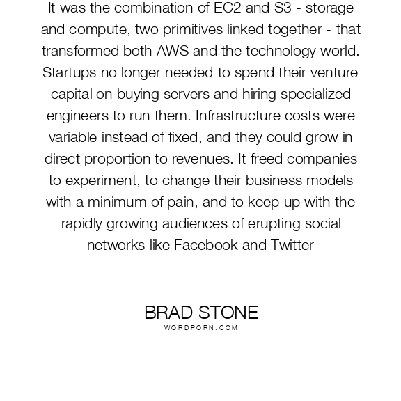 It was the combination of EC2 and S3 - storage and compute, two primitives linked together - that transformed both AWS and the technology world. Startups no longer needed to spend their venture capital on buying servers and hiring specialized engineers to run them. Infrastructure costs were variable instead of fixed, and they could grow in direct proportion to revenues. It freed companies to experiment, to change their business models with a minimum of pain, and to keep up with the rapidly growing audiences of erupting social networks like Facebook and Twitter