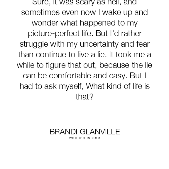 Sure, it was scary as hell, and sometimes even now I wake up and wonder what happened to my picture-perfect life. But I'd rather struggle with my uncertainty and fear than continue to live a lie. It took me a while to figure that out, because the lie can be comfortable and easy. But I had to ask myself, What kind of life is that?