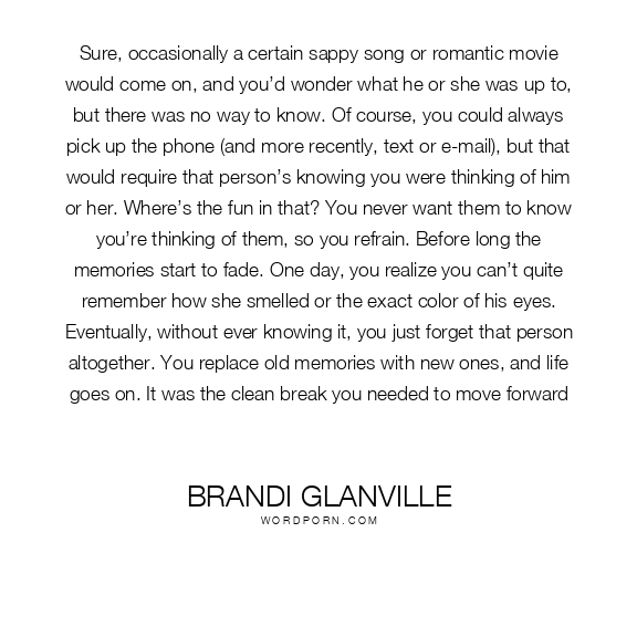 Sure, occasionally a certain sappy song or romantic movie would come on, and you’d wonder what he or she was up to, but there was no way to know. Of course, you could always pick up the phone (and more recently, text or e-mail), but that would require that person’s knowing you were thinking of him or her. Where’s the fun in that? You never want them to know you’re thinking of them, so you refrain. Before long the memories start to fade. One day, you realize you can’t quite remember how she smelled or the exact color of his eyes. Eventually, without ever knowing it, you just forget that person altogether. You replace old memories with new ones, and life goes on. It was the clean break you needed to move forward