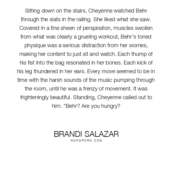 Sitting down on the stairs, Cheyenne watched Behr through the slats in the railing. She liked what she saw. Covered in a fine sheen of perspiration, muscles swollen from what was clearly a grueling workout, Behr’s toned physique was a serious distraction from her worries, making her content to just sit and watch. Each thump of his fist into the bag resonated in her bones. Each kick of his leg thundered in her ears. Every move seemed to be in time with the harsh sounds of the music pumping through the room, until he was a frenzy of movement. It was frighteningly beautiful. Standing, Cheyenne called out to him. “Behr? Are you hungry?