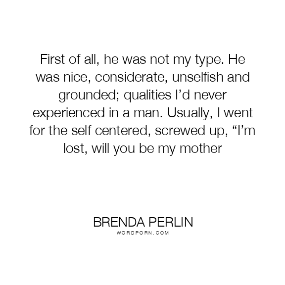 First of all, he was not my type. He was nice, considerate, unselfish and grounded; qualities I’d never experienced in a man. Usually, I went for the self centered, screwed up, “I’m lost, will you be my mother