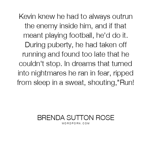 Kevin knew he had to always outrun the enemy inside him, and if that meant playing football, he'd do it. During puberty, he had taken off running and found too late that he couldn't stop. In dreams that turned into nightmares he ran in fear, ripped from sleep in a sweat, shouting,"Run!