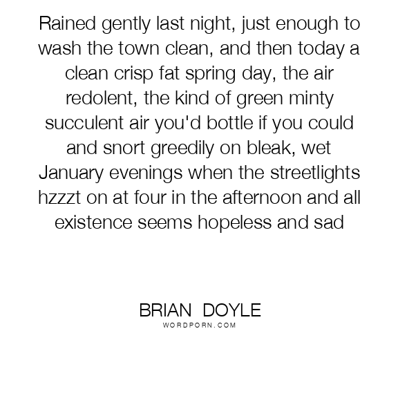 Rained gently last night, just enough to wash the town clean, and then today a clean crisp fat spring day, the air redolent, the kind of green minty succulent air you'd bottle if you could and snort greedily on bleak, wet January evenings when the streetlights hzzzt on at four in the afternoon and all existence seems hopeless and sad
