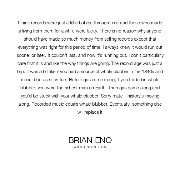 I think records were just a little bubble through time and those who made a living from them for a while were lucky. There is no reason why anyone should have made so much money from selling records except that everything was right for this period of time. I always knew it would run out sooner or later. It couldn't last, and now it's running out. I don't particularly care that it is and like the way things are going. The record age was just a blip. It was a bit like if you had a source of whale blubber in the 1840s and it could be used as fuel. Before gas came along, if you traded in whale blubber, you were the richest man on Earth. Then gas came along and you'd be stuck with your whale blubber. Sorry mate – history's moving along. Recorded music equals whale blubber. Eventually, something else will replace it