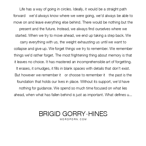 Life has a way of going in circles. Ideally, it would be a straight path forward––we'd always know where we were going, we'd always be able to move on and leave everything else behind. There would be nothing but the present and the future. Instead, we always find ourselves where we started. When we try to move ahead, we end up taking a step back. We carry everything with us, the weight exhausting us until we want to collapse and give up. We forget things we try to remember. We remember things we'd rather forget. The most frightening thing about memory is that it leaves no choice. It has mastered an incomprehensible art of forgetting. It erases, it smudges, it fills in blank spaces with details that don't exist. But however we remember it––or choose to remember it––the past is the foundation that holds our lives in place. Without its support, we'd have nothing for guidance. We spend so much time focused on what lies ahead, when what has fallen behind is just as important. What defines us isn't where we're going, but where we've been. Although there are places and people we will never see again, and although we move on and let them go, they remain a part of who we are. There are things that will never change, things we will carry along with us always. But as we venture into the murky future, we must find our strength by learning to leave things behind