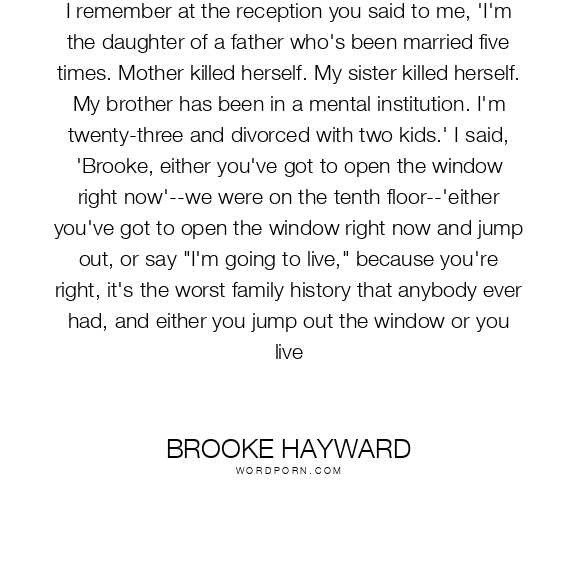 I remember at the reception you said to me, 'I'm the daughter of a father who's been married five times. Mother killed herself. My sister killed herself. My brother has been in a mental institution. I'm twenty-three and divorced with two kids.' I said, 'Brooke, either you've got to open the window right now'--we were on the tenth floor--'either you've got to open the window right now and jump out, or say "I'm going to live," because you're right, it's the worst family history that anybody ever had, and either you jump out the window or you live