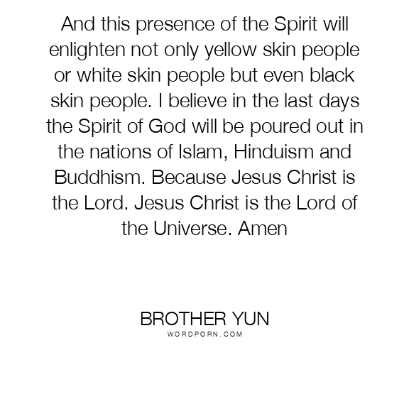 And this presence of the Spirit will enlighten not only yellow skin people or white skin people but even black skin people. I believe in the last days the Spirit of God will be poured out in the nations of Islam, Hinduism and Buddhism. Because Jesus Christ is the Lord. Jesus Christ is the Lord of the Universe. Amen