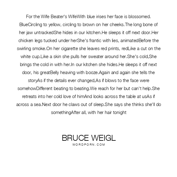 For the Wife Beater's WifeWith blue irises her face is blossomed. BlueCircling to yellow, circling to brown on her cheeks.The long bone of her jaw untrackedShe hides in our kitchen.He sleeps it off next door.Her chicken legs tucked under herShe's frantic with lies, animatedBefore the swirling smoke.On her cigarette she leaves red prints, redLike a cut on the white cup.Like a skin she pulls her sweater around her.She's cold,She brings the cold in with her.In our kitchen she hides.He sleeps it off next door, his greatBelly heaving with booze.Again and again she tells the storyAs if the details ever changed,As if blows to the face were somehowDifferent beating to beating.We reach for her but can't help.She retreats into her cold love of himAnd looks across the table at usAs if across a sea.Next door he claws out of sleep.She says she thinks she'll do somethingAfter all, with her hair tonight