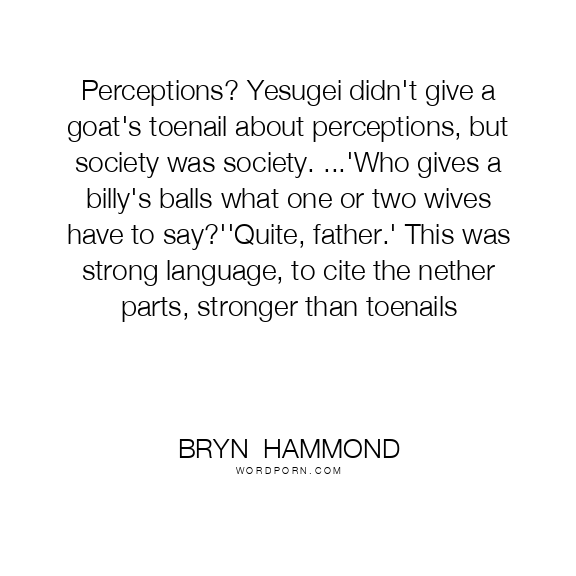 Perceptions? Yesugei didn't give a goat's toenail about perceptions, but society was society. ...'Who gives a billy's balls what one or two wives have to say?''Quite, father.' This was strong language, to cite the nether parts, stronger than toenails