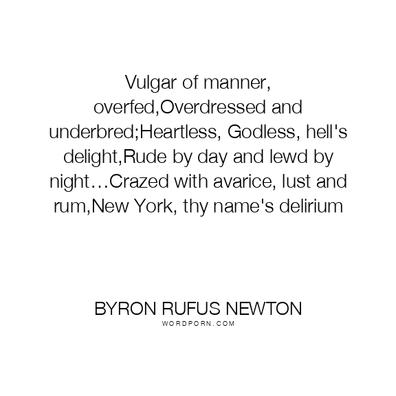Vulgar of manner, overfed,Overdressed and underbred;Heartless, Godless, hell's delight,Rude by day and lewd by night…Crazed with avarice, lust and rum,New York, thy name's delirium
