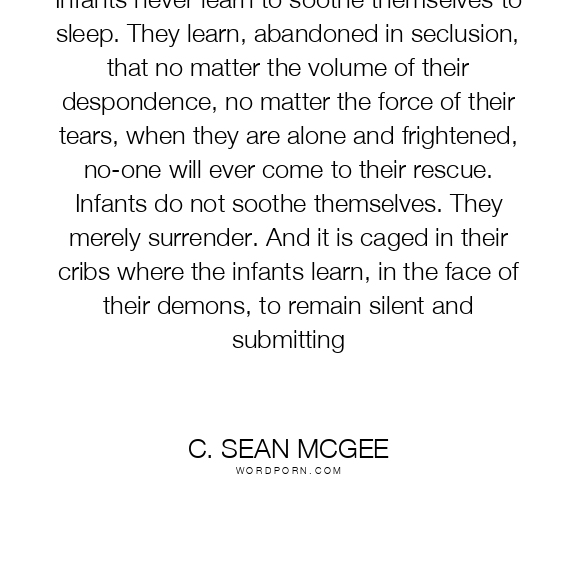 Infants never learn to soothe themselves to sleep. They learn, abandoned in seclusion, that no matter the volume of their despondence, no matter the force of their tears, when they are alone and frightened, no-one will ever come to their rescue. Infants do not soothe themselves. They merely surrender. And it is caged in their cribs where the infants learn, in the face of their demons, to remain silent and submitting