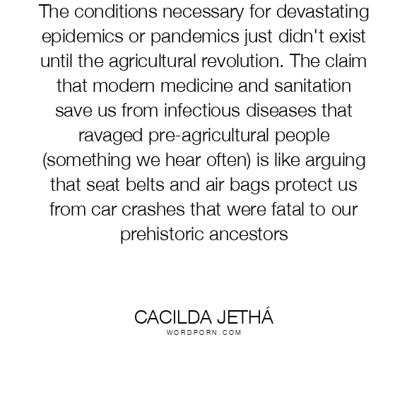 The conditions necessary for devastating epidemics or pandemics just didn't exist until the agricultural revolution. The claim that modern medicine and sanitation save us from infectious diseases that ravaged pre-agricultural people (something we hear often) is like arguing that seat belts and air bags protect us from car crashes that were fatal to our prehistoric ancestors