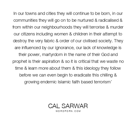 In our towns and cities they will continue to be born, in our communities they will go on to be nurtured & radicalised & from within our neighbourhoods they will terrorise & murder our citizens including women & children in their attempt to destroy the very fabric & order of our civilised society. They are influenced by our ignorance, our lack of knowledge is their power, martyrdom in the name of their God and prophet is their aspiration & so it is critical that we waste no time & learn more about them & this ideology they follow before we can even begin to eradicate this chilling & growing endemic Islamic faith based terrorism’